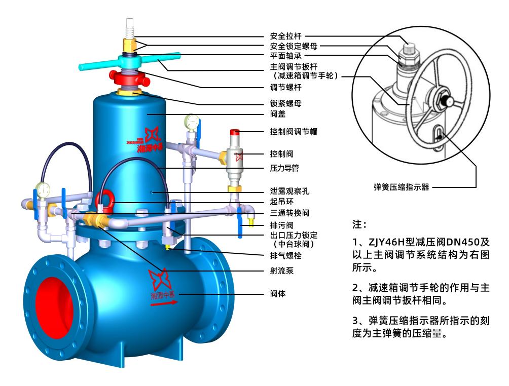 由閥體、閥蓋、閥座、活塞、閥桿、節流錐、主閥調節系統(主閥調節扳桿或減速箱調節手輪、調節螺桿)、出口壓力鎖定系統(安全拉桿、安全鎖定螺母、平面軸承、鎖緊螺母)所組成。