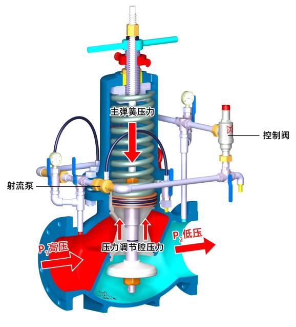 ZJY46H組合式減壓閥的工作原理是由反饋系統上的控制閥與射流泵控制調節腔壓力,使壓力調節腔的壓力與主彈簧壓力形成平衡。