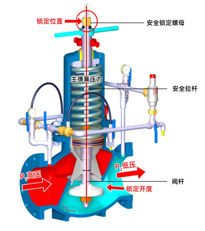 出口壓力鎖定裝置由安全鎖定螺母、安全拉桿與閥桿組成,有效地確保了出口壓力P2值 的安全性。