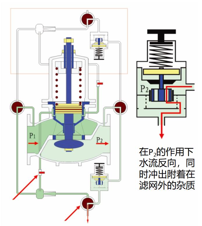 減壓閥的反沖排污裝置能有效地防止反饋控制系統的堵塞,使減壓閥在多泥沙的水質中保持良好的工況。