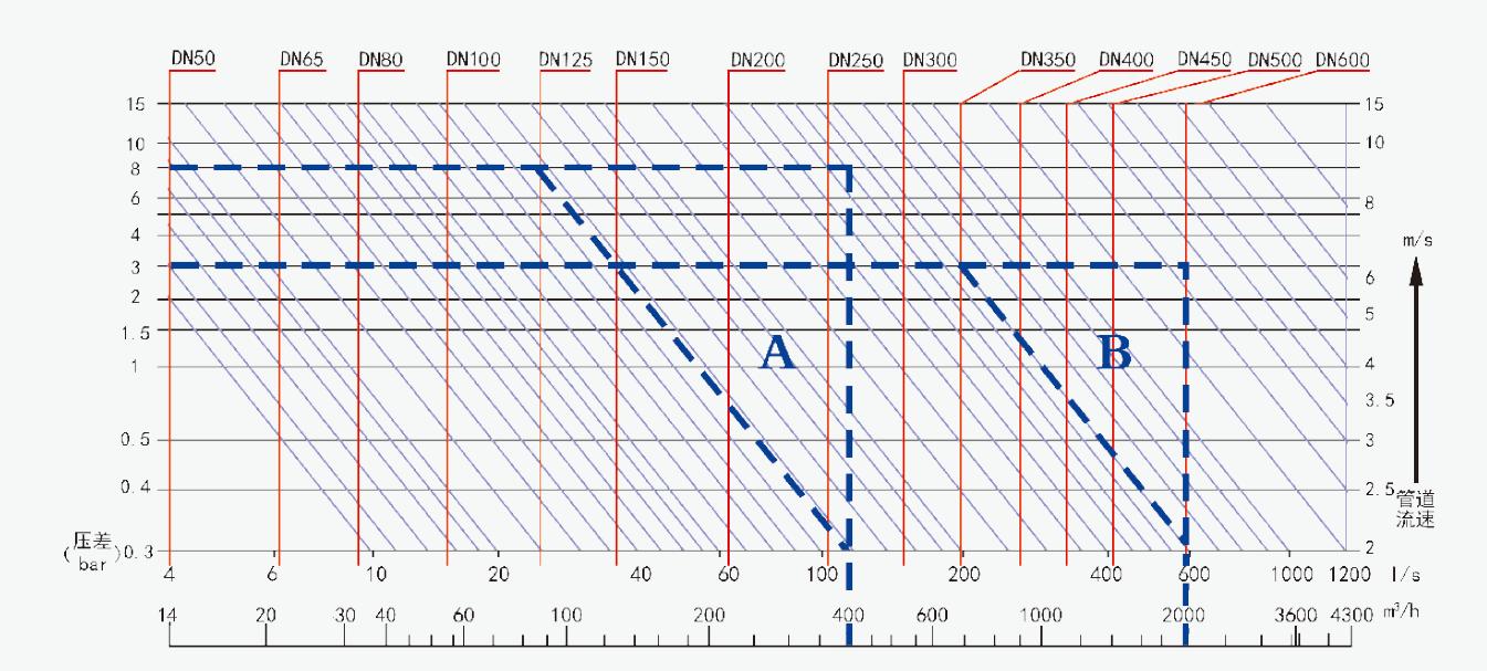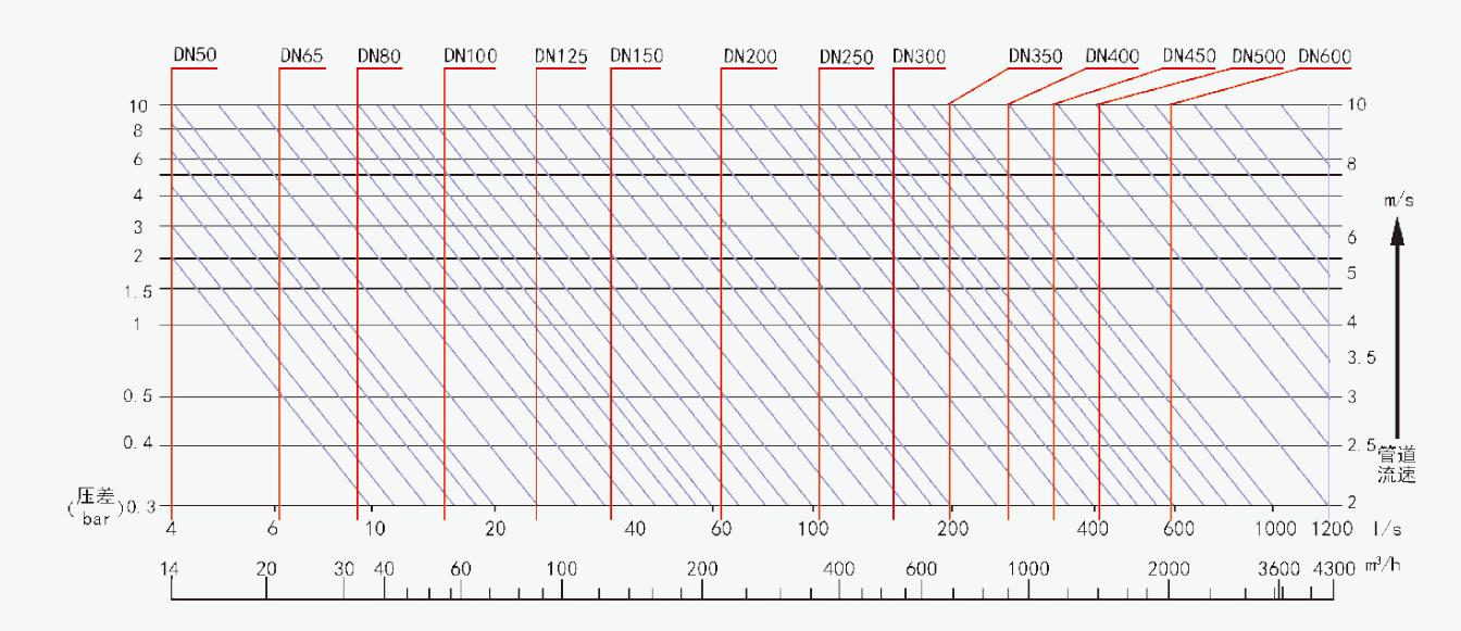 對應的管道流速為:DN500=2.8m/s; DN450=3.5m/s; DN400=4.5m/s;