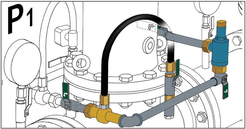 2、旋轉三通排污閥90°,順向水流切斷,在P2的作用下水流反向,同時沖出附著在濾網外的雜質;