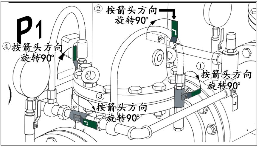2、旋轉兩個三通切換閥90°(旋轉的順序為先低壓后高壓);